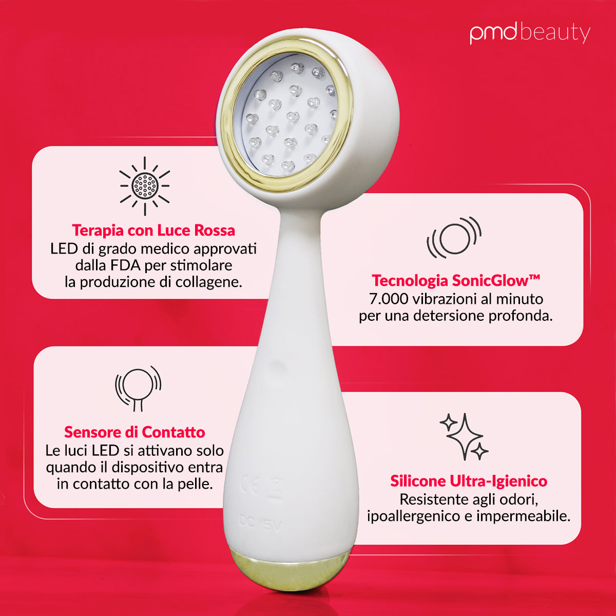 PMD Clean Redvolution™ unisce il potere detergente di PMD Clean™ con l’azione ringiovanente della tecnologia led. Da un lato, la tecnologia SonicGlow™ offre una detersione delicata ma profonda, lasciando il viso fresco e pulito. Dall’altro, 19 potenti LED a luce rossa lavorano per uniformare, liftare e rassodare visibilmente la pelle, mantenendola giovane e luminosa.